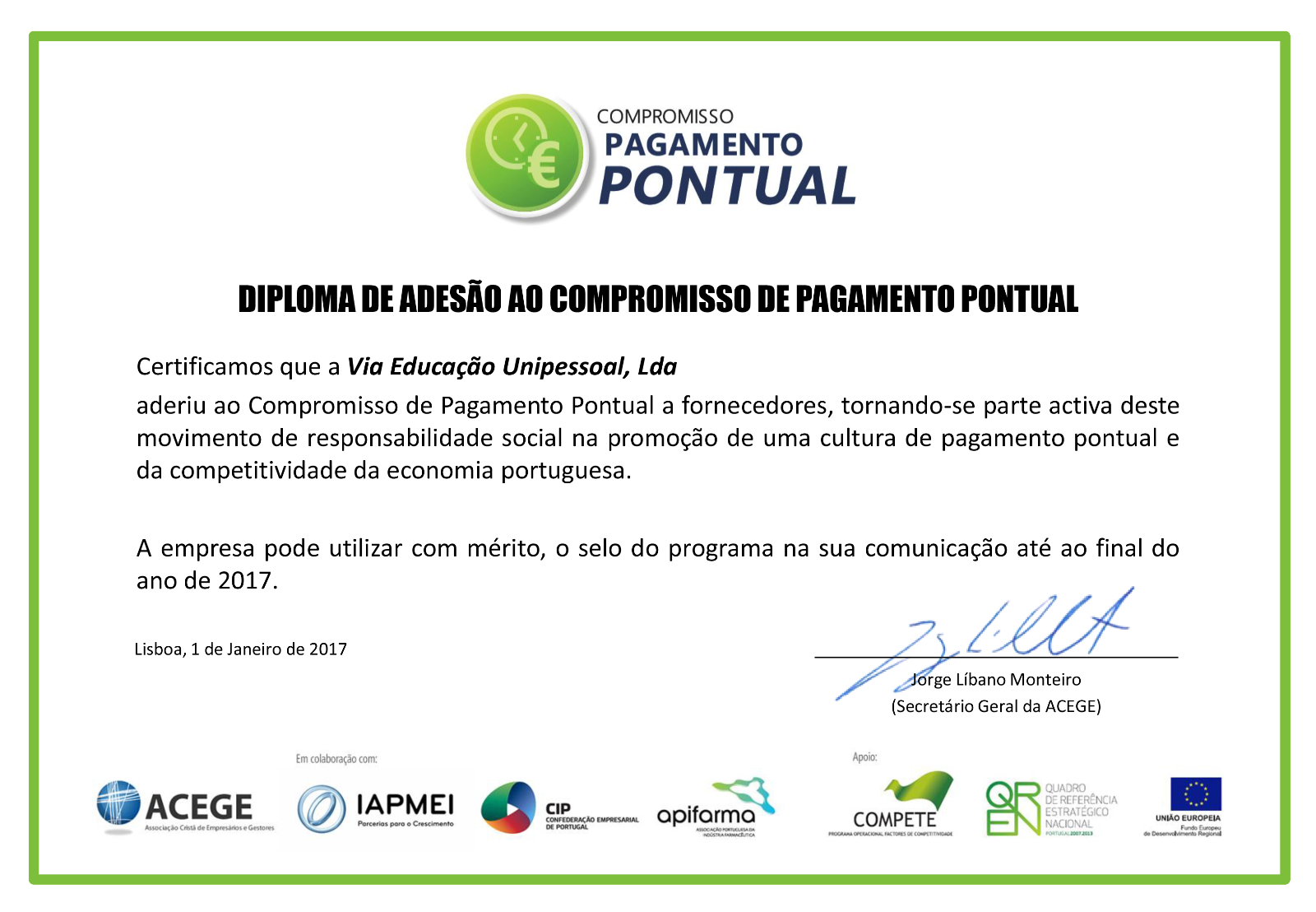 A Via Educação continua no programa Compromisso Pagamento Pontual que é essencial para a promoção de uma nova cultura de pagamentos e para a competitividade das empresas e da economia portuguesa. Em nome dos presidentes da ACEGE, IAPMEI, CIP e APIFARMA, recebemos o diploma de adesão ao compromisso de pagamento pontual Já são mais de 850 empresas aderentes, provenientes de todo o país, de diferentes dimensões e sectores de actividades, numa demonstração clara de que com organização e esforço é possível honrar os compromissos com os fornecedores. Foi agradecido o exemplo dado pela nossa adesão a este compromisso reforçando o caminho a percorrer. A Via Educação está de parabéns! Muito obrigada.